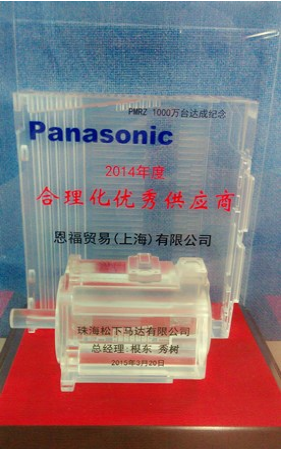2015年3月20日,恩福貿(mào)易(上海)有限公司獲得了珠海松下馬達有限公司頒發(fā)的2014年度“合理化優(yōu)秀供應(yīng)商”獎。頒獎儀式在松下的會議室舉行,恩福的市場區(qū)域經(jīng)理洪道弘,銷售部副科長嚴志楹以及銷售擔(dān)當(dāng)梁博出席了頒獎儀式并代表恩福領(lǐng)取了獎項。